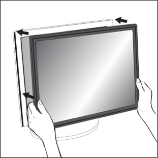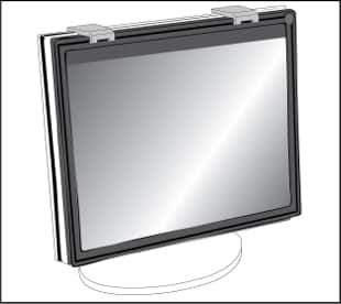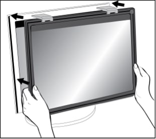 Hanger arms snap onto 3M™ Framed Privacy Filters and then rest on the top of a monitor, allowing for easy removal, cleaning and reattachment.